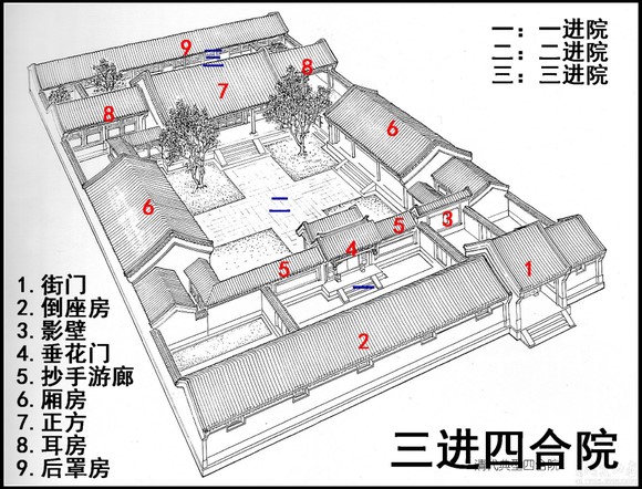 [1] 三进院子 เรือนซานจิ้น คือบ้านยุคโบราณที่ชั้นประตูผ่านเข้าบ้านสามด่าน ดูจากรูปภาพประกอบด้านล่าง